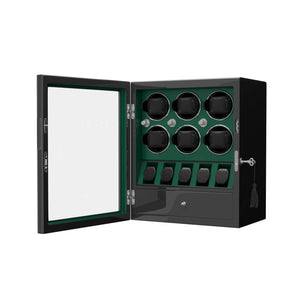 • This classic 6-watch winders from Dukwin presents the ideal solution for winding up to 6 watches at the same time and with a watch deck storage to display your another 5 watches.  All presented in an elegant closed display case.  Showcasing our usual commitment to quality design and engineering, this 6-watch winder incorporates a number of luxury features that make it stand out from the crowd.