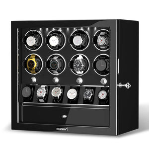 • This classic 8-watch winders from Dukwin presents the ideal solution for winding up to 8 watches at the same time and with a watch deck storage to display your another 6 watches.  All presented in an elegant closed display case.  Showcasing our usual commitment to quality design and engineering, this 8-watch winder incorporates a number of luxury features that make it stand out from the crowd.