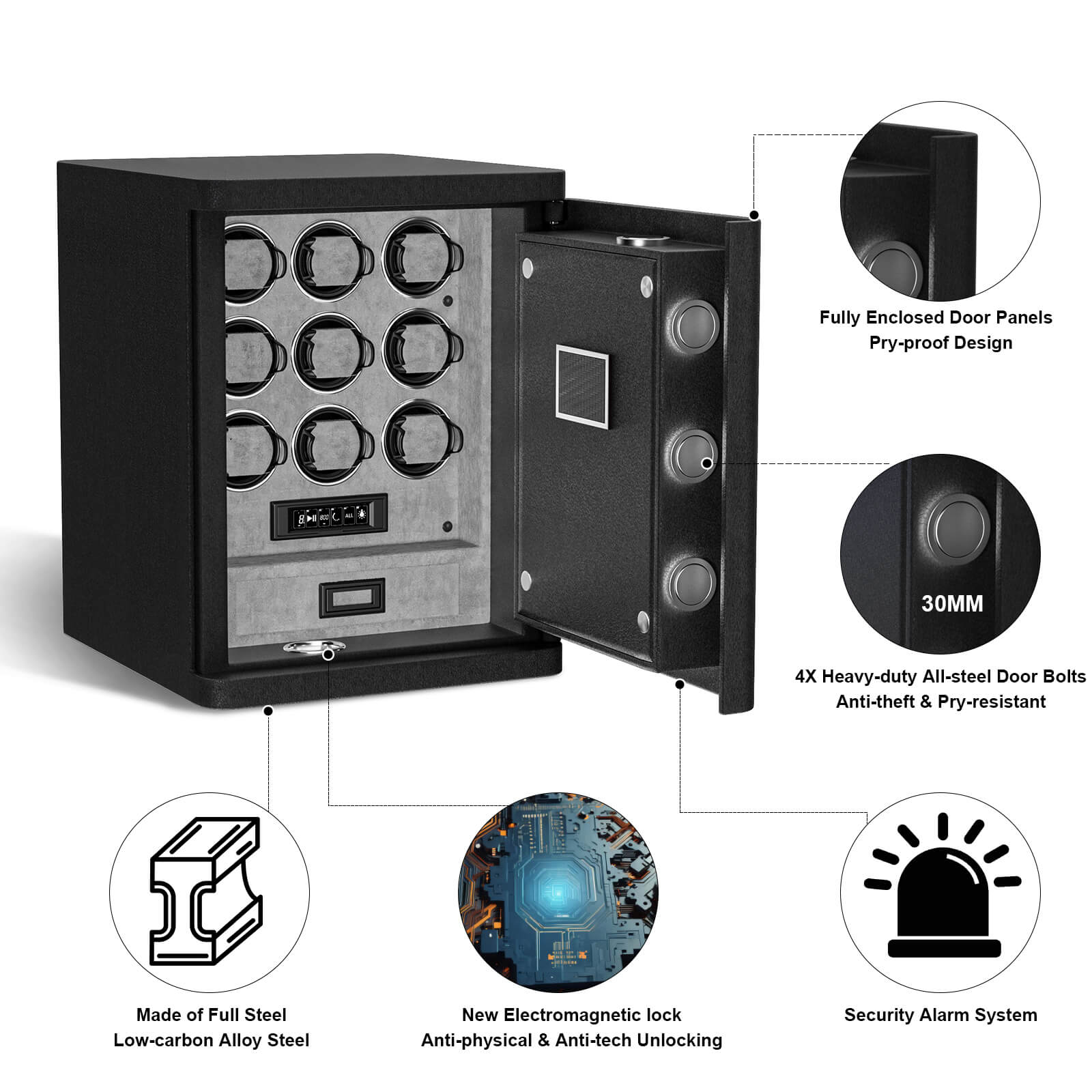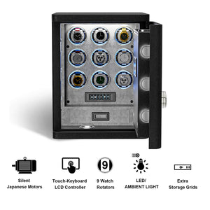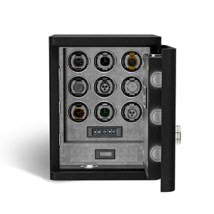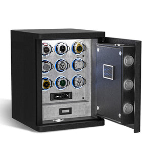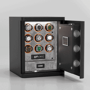 The Obsidian Veil Series watch winder safe is a multifunctional lockable 9-unit watch winding system with additional storage, designed to securely and reliably wind your timepiece collection.