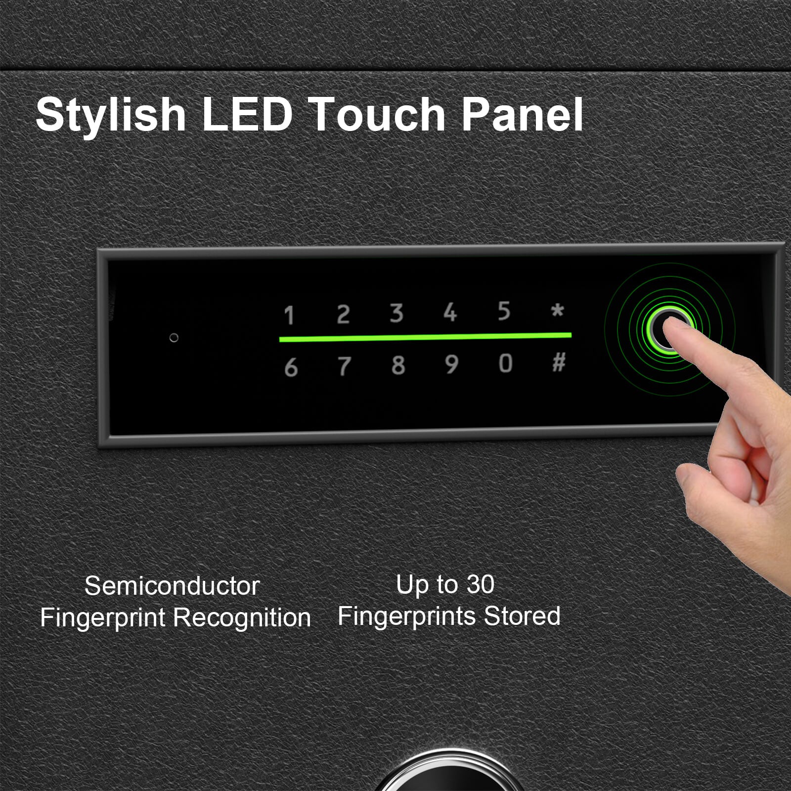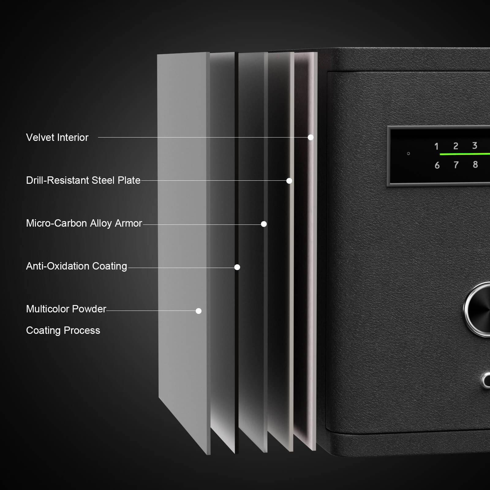 Innovative enclosed door panel with integrated laser cutting reduces door gap spacing and greatly enhances anti-prying security. Designed with a hidden retractable metal handle, it eliminates the issue of protruding handles inside the safe, ensuring a sleeker and more practical storage experience.