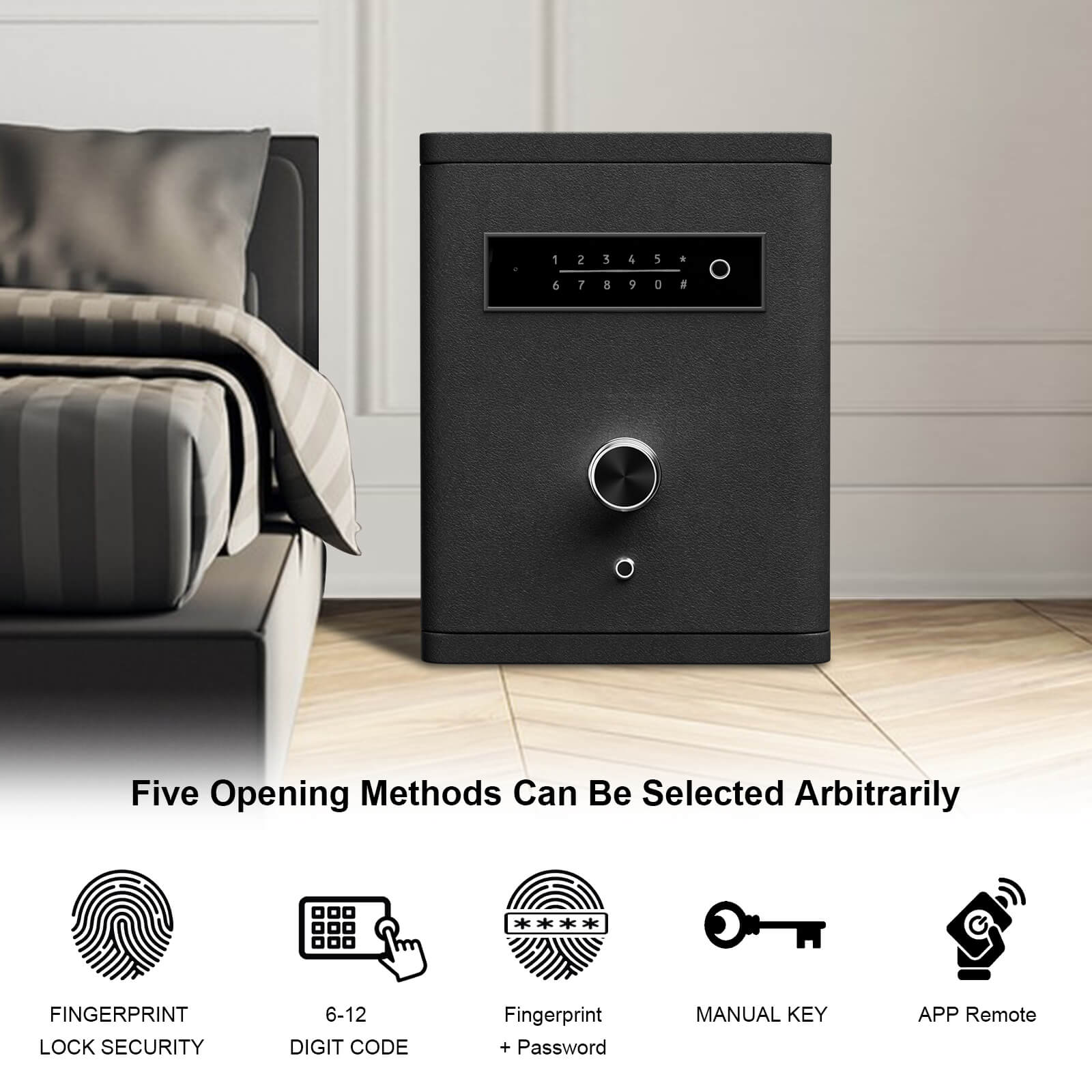 Featuring a smart semiconductor fingerprint sensor, it reads beneath the skin’s texture for deep recognition and unlocks in just 0.3 seconds. With five unlocking options available - including biometric fingerprint, keypad code, override key, fingerprint password, and remote APP access - you can choose the method that best suits your needs. In addition, the included remote control allows effortless programming and winding.