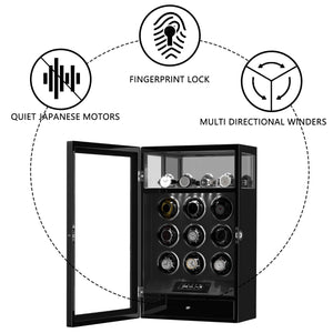9 Watch Winders with Extra 4 Watches Storage LCD Remote Control Fingerprint Lock - Black