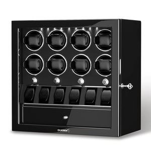 • Ce remontoir classique Dukwin pour 8 montres est la solution idéale pour remonter jusqu'à 8 montres simultanément, avec un rangement pour 6 autres. Le tout est présenté dans un élégant coffret de présentation fermé. Fidèle à notre engagement constant pour une conception et une ingénierie de qualité, ce remontoir pour 8 montres intègre de nombreuses fonctionnalités luxueuses qui le distinguent des autres.
