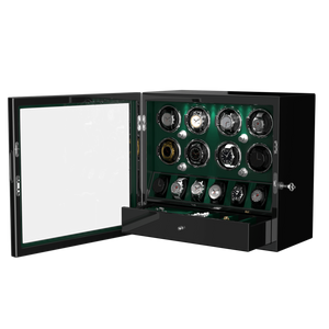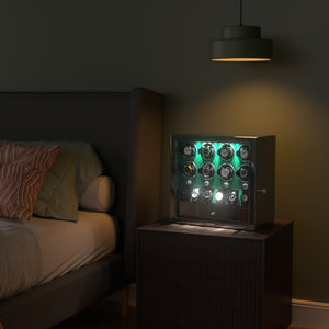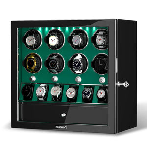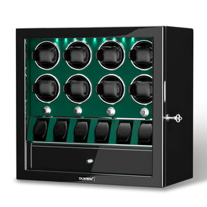 Matériau : Le remontoir automatique DUKWIN pour 8 montres est fabriqué en bois fait à la main avec une fenêtre en verre organique acrylique, un extérieur élégant en piano brillant et un intérieur en cuir végétalien.