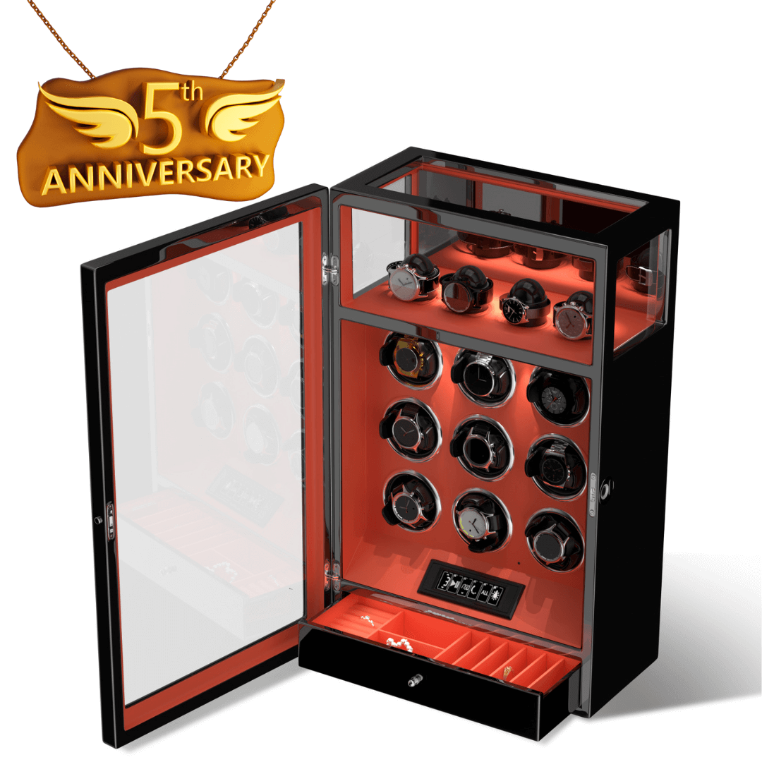 Remontoir à 9 montres avec verrouillage par empreinte digitale et rangement supplémentaire pour 4 montres, télécommande LCD - Orange flamme