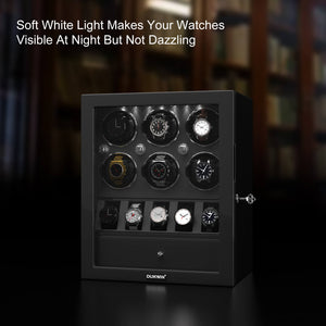Materiale : il carica orologi automatico DUKWIN per 6 orologi è realizzato in legno fatto a mano con finestra in vetro acrilico organico, elegante esterno lucido e interno in pelle vegana.