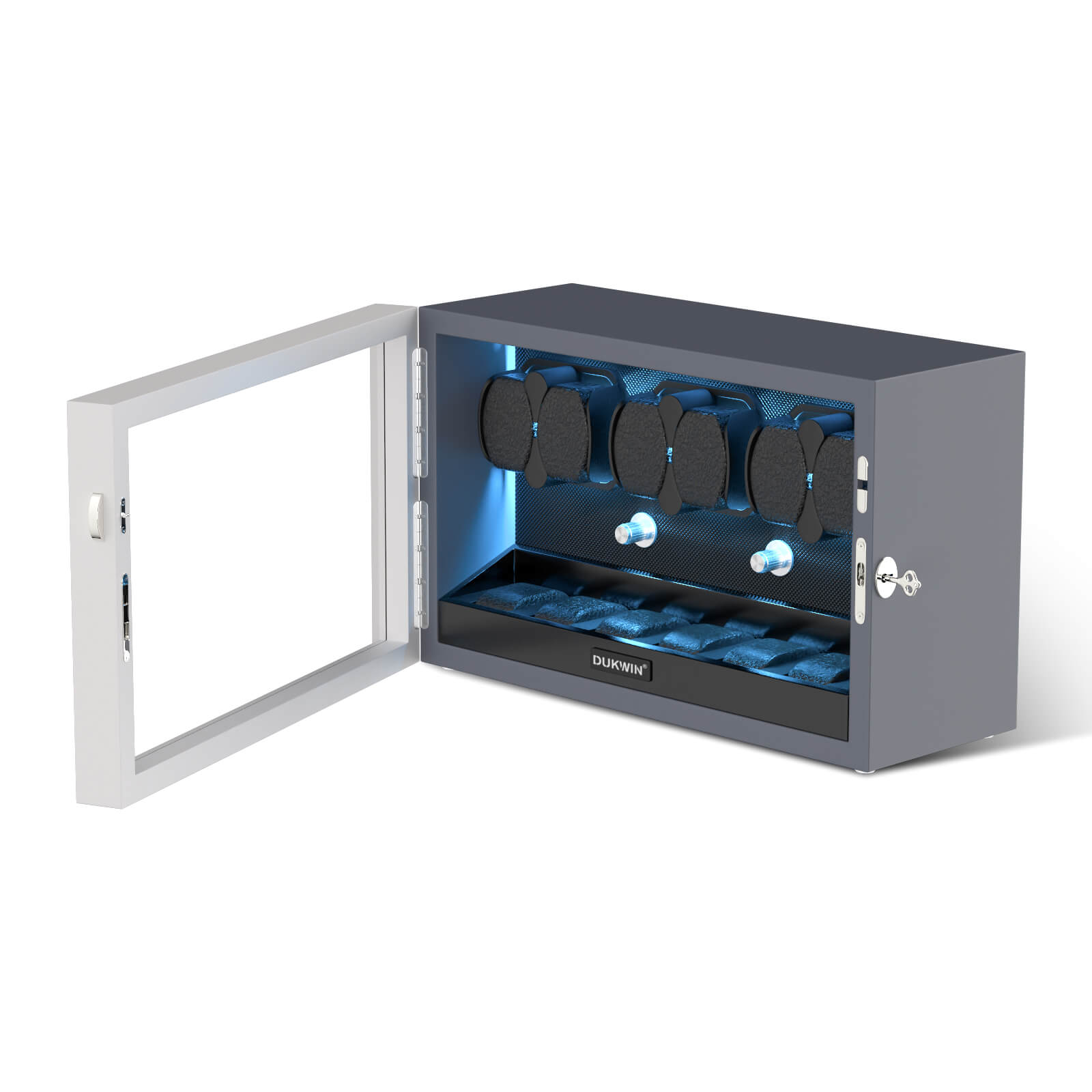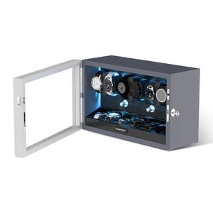 6 + 6 Watch Winder with Extra Storages Aurora Blue Light Quiet Motors - Silken Grey