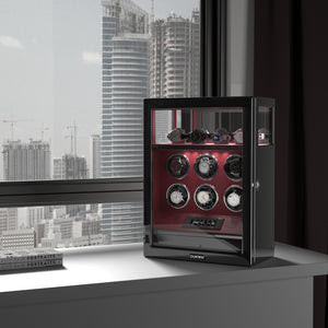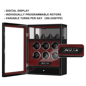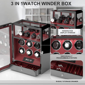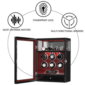 Fingerprint Lock 6 Watch Winders with Extra Watches Storage LCD Remote Control - Red