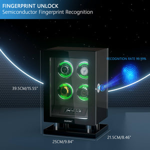 - STATE OF THE ART TECHNOLOGY: Use your fingerprint to lock and unlock the winder to prevent unwanted access. The fingerprint sensor can set up to 20 fingerprint users(2 administrator and 18 user accounts). Besides, Our watch winder box has two unlocking methods, fingerprint verification and using admin key. The dual unlocking method gives you double protection.