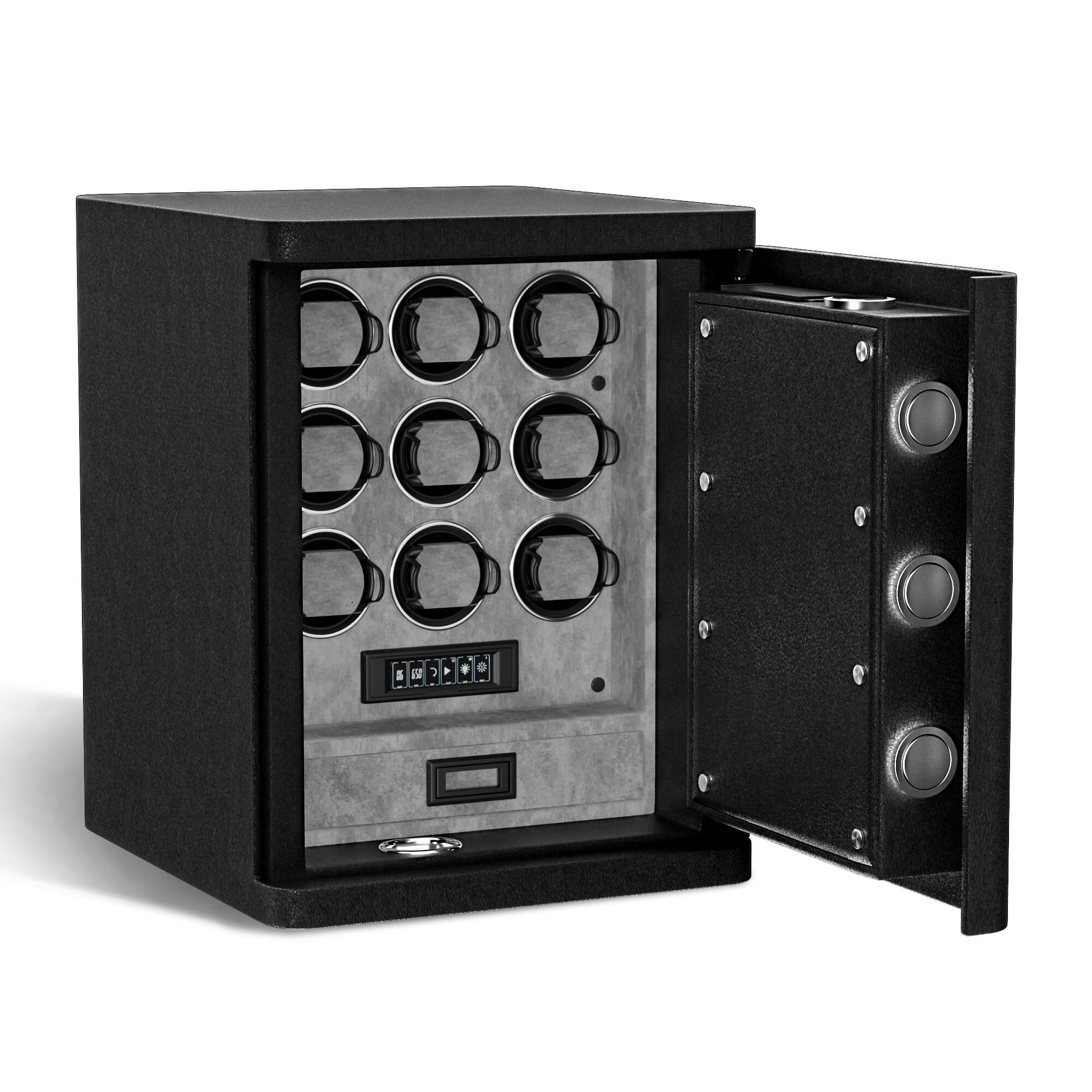 The Obsidian Veil Series watch winder safe is a multifunctional lockable 9-unit watch winding system with additional storage, designed to securely and reliably wind your timepiece collection.