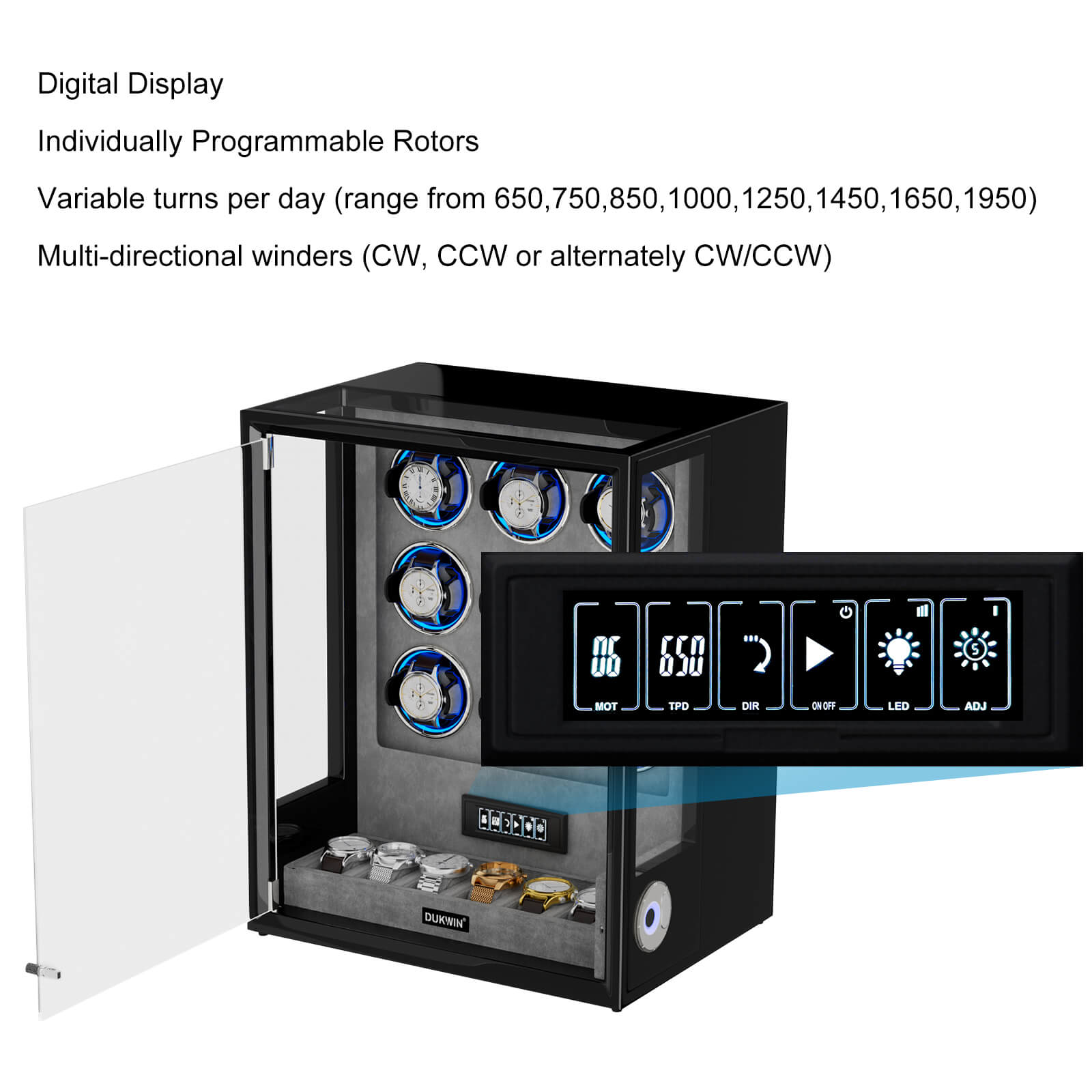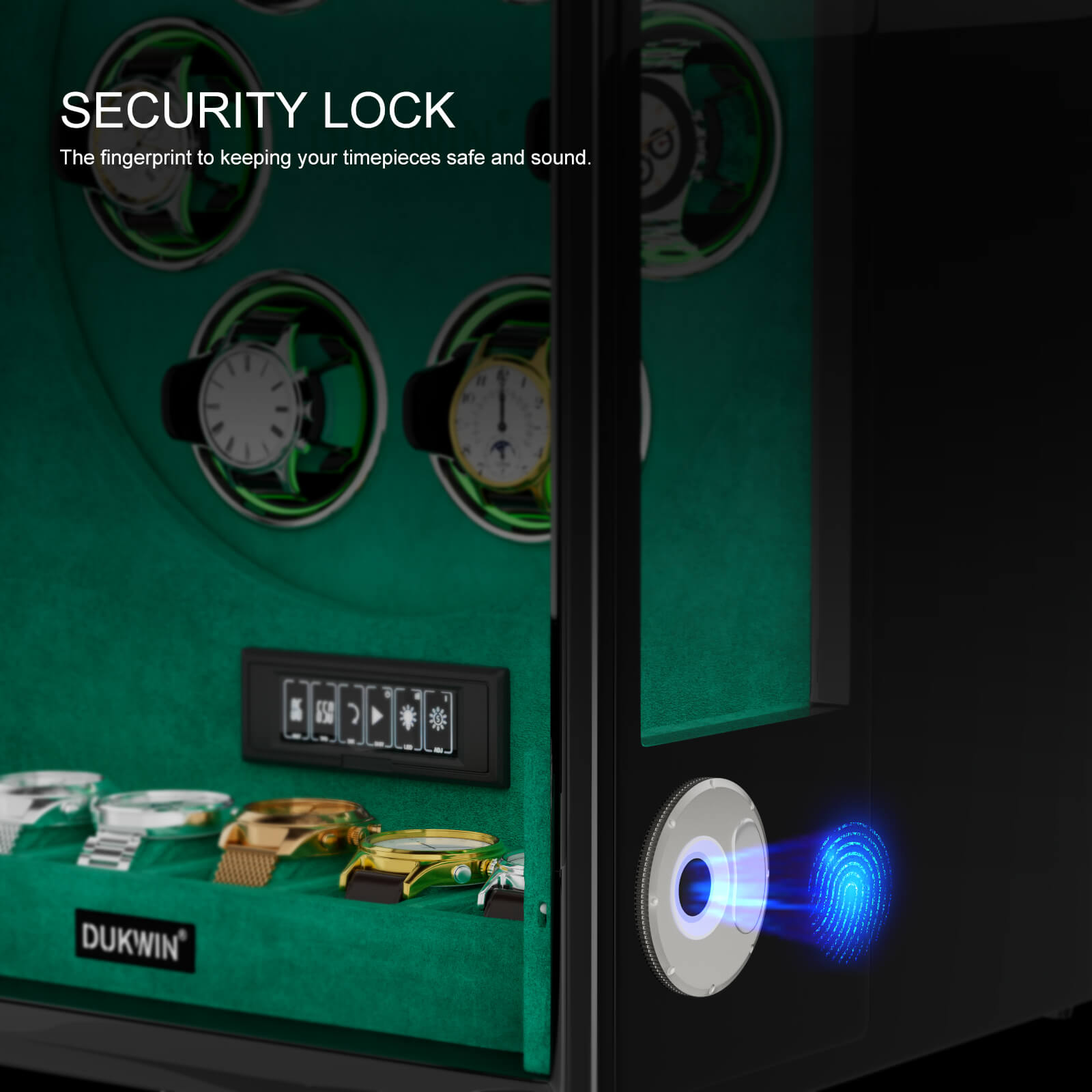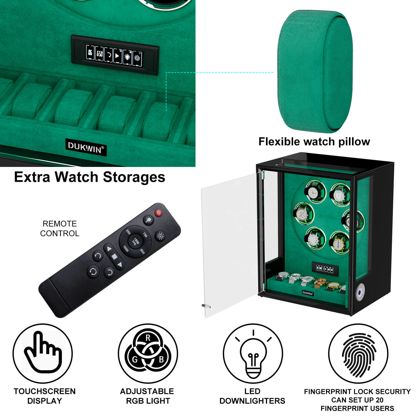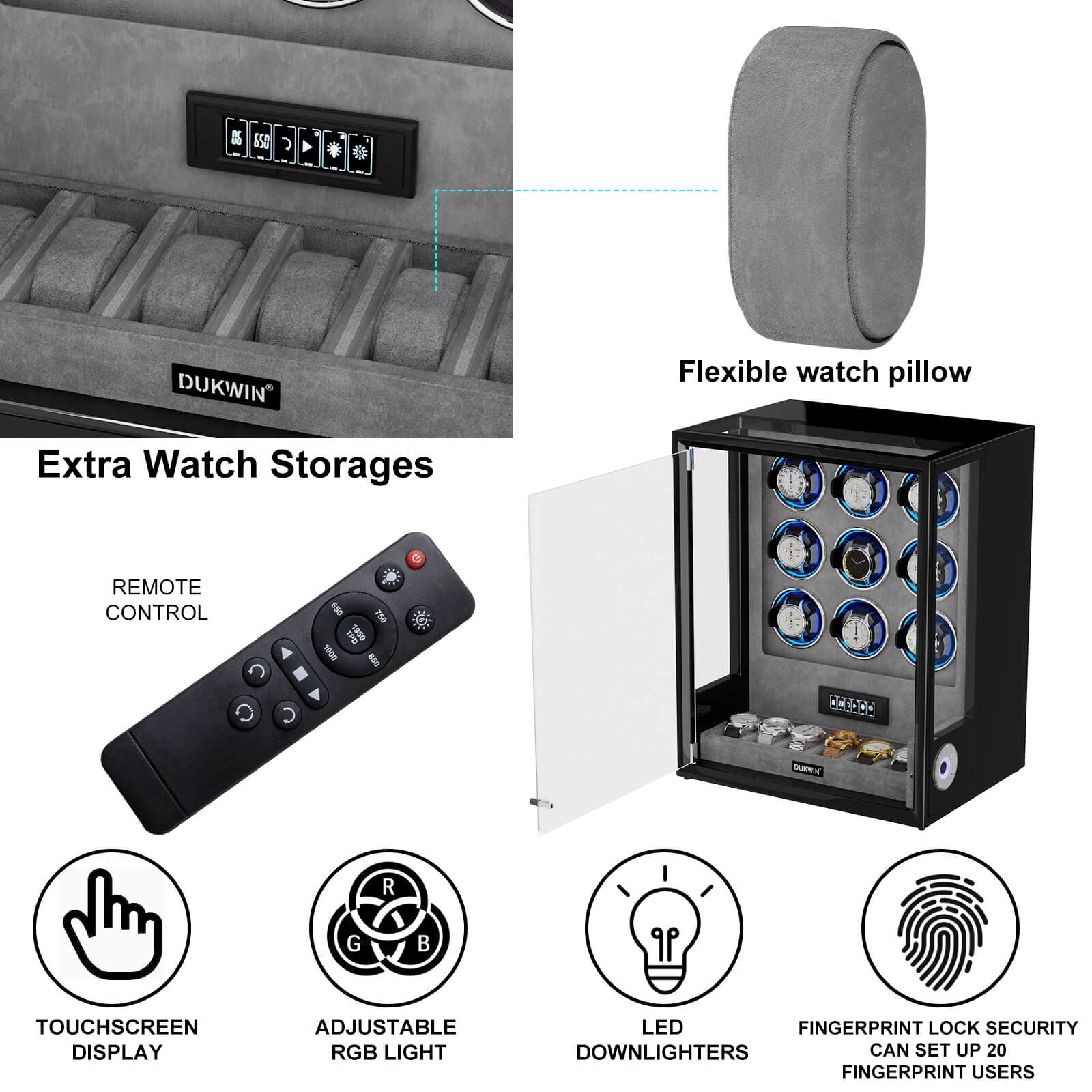 Type Extra Watches Storage, Fingerprint Unlock, RGB light, Remote Control, LCD Touchscreen, Ambient Blue Light