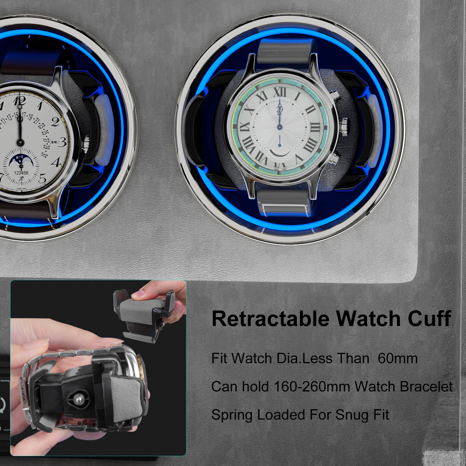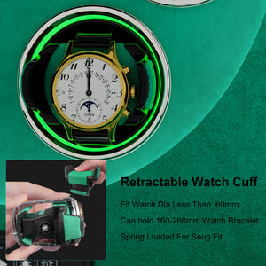 Lock-in Dynamic Cuff: Patented lock-in dynamic cuff ‘locks’ your timepiece into the rotator drum for a secure fit. Accommodate most wrist sizes without putting pressure on your bracelet.