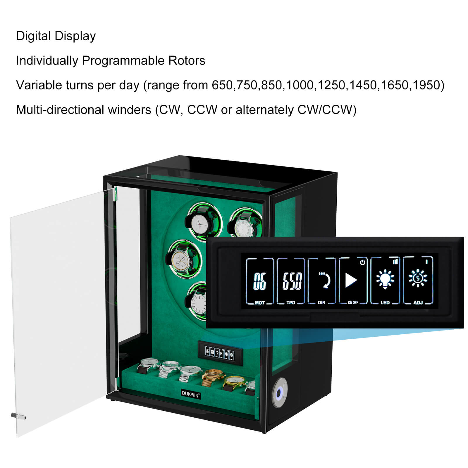 Innovative Touch Display: Individual control of the motors via touch operation. Can be set between 650 and 1950 TPD (turns per day). Double the amount of TPD by selecting bi-directional setting.