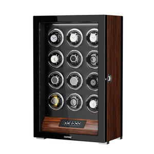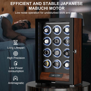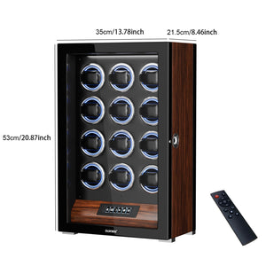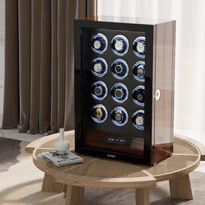 12 Watch Winders with Fingerprint Unlock RGB Light LCD Remote Control Ultra Quiet Motor - Walnut